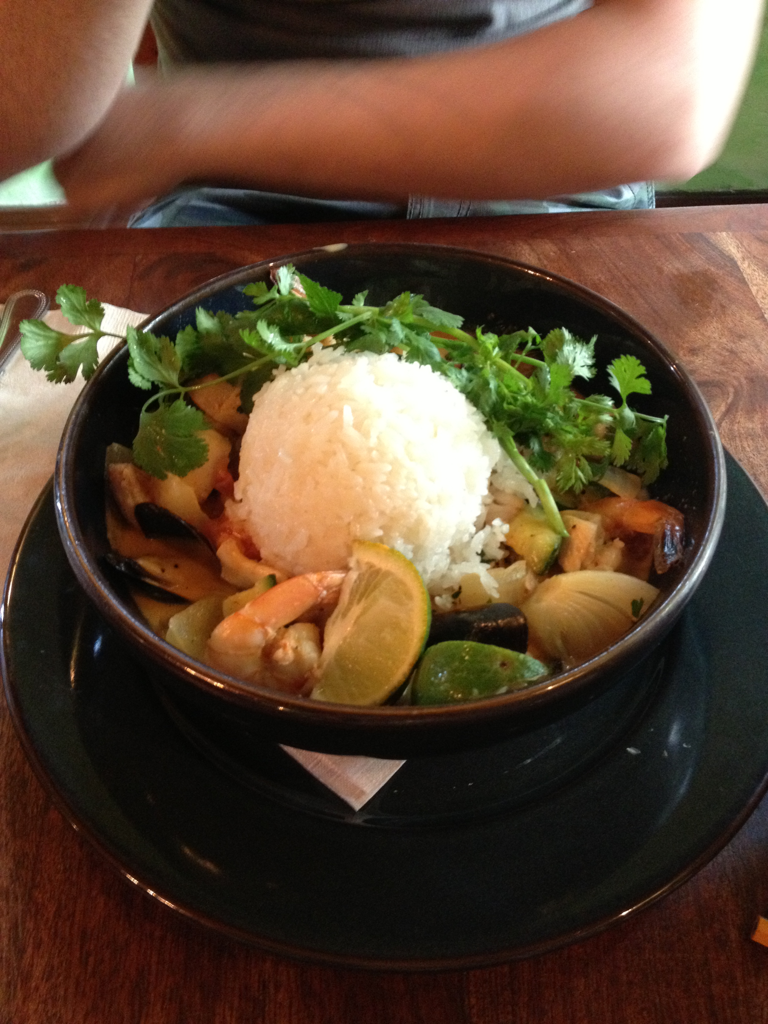 The seafood curry was plentiful. With lots of mahi mahi, scallops, clams, mussels, shrimp and veggies like tomatoes and zucchini, all in a warm red curry coconut broth with jasmine rice.